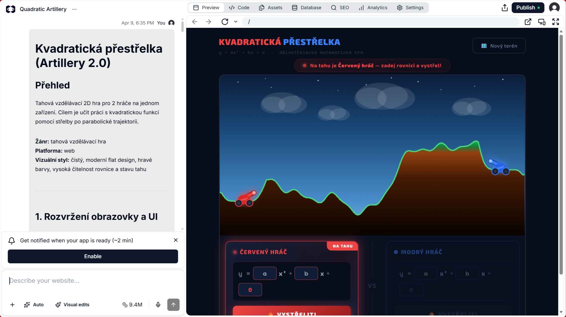 Poté, co aplikace skončí s vývojem, budete mít na obrazovce dvě části – vpravo je puštěná samotná aplikace, vlevo pak chatovací okno, kde můžete dále aplikaci upravovat – prostě tak, že svými slovy řeknete, co se má změnit, doplnit atd. Pro zajímavost, první verze této hry „sežrala“ pouhých 680 tisíc kreditů, pak jsem jí ještě ladil, takže celkem jsem byl asi na 2.5 milionech kreditů.
